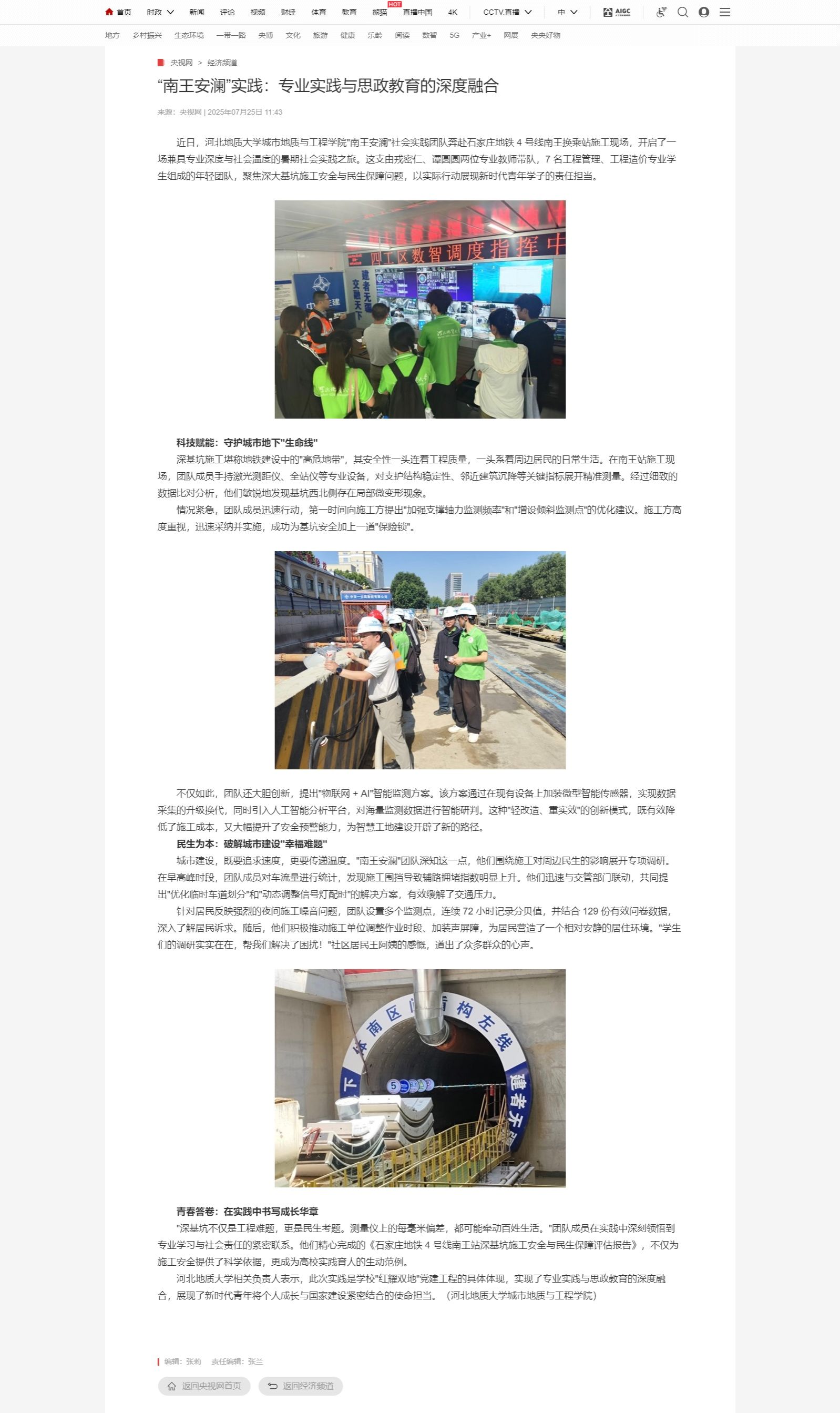 近日,beat365在线唯一官网登录城市地质与工程学院"南王安澜"社会实践团队奔赴石家庄地铁 4 号线南王换乘站施工现场,开启了一场兼具专业深度与社会温度的暑期社会实践之旅。这支由戎密仁、谭圆圆两位专业教师带队,7 名工程管理、工程造价专业学生组成的年轻团队,聚焦深大基坑施工安全与民生保障问题,以实际行动展现新时代青年学子的责任担当。