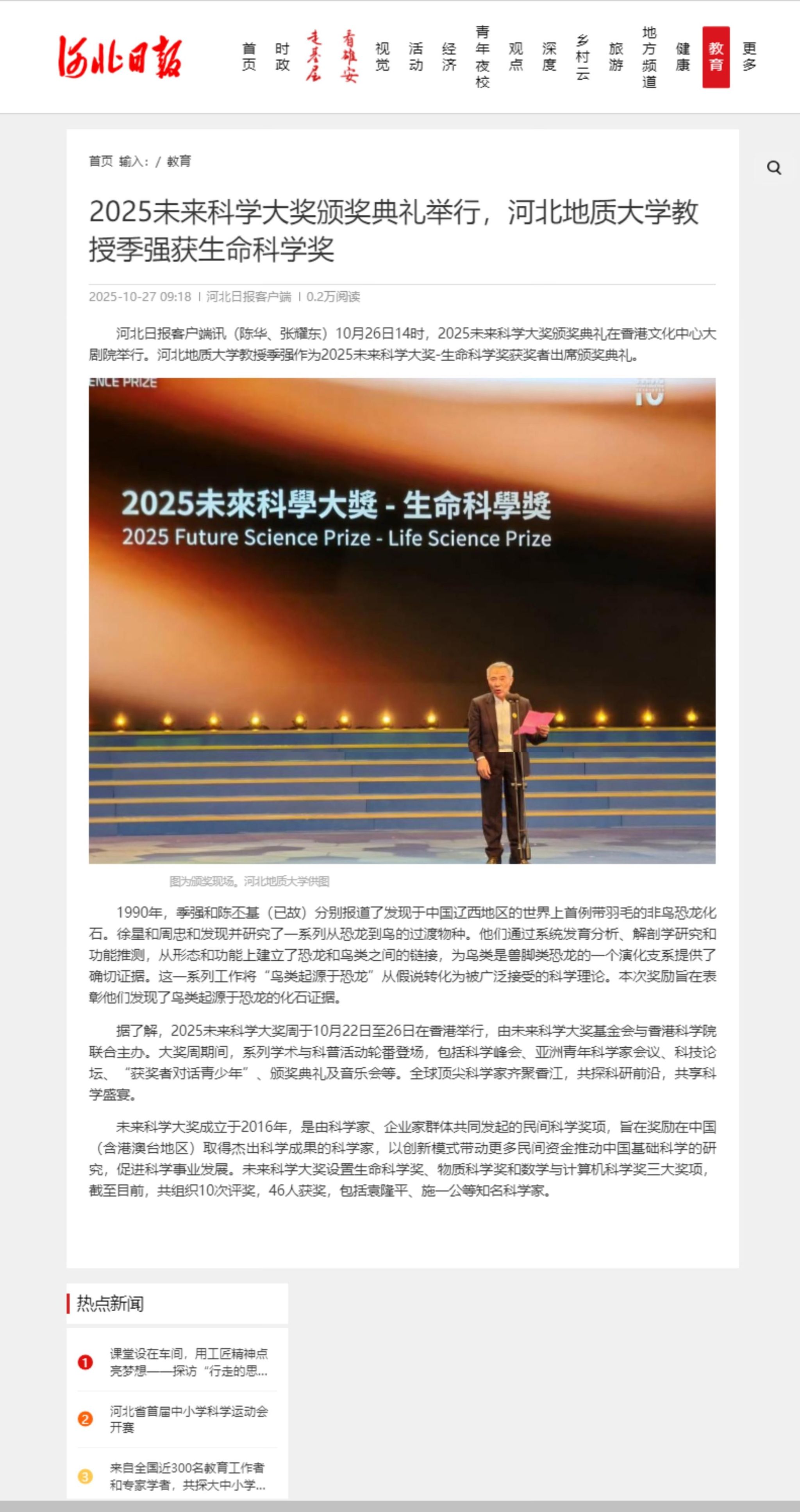 【河北日报】2025未来科学大奖颁奖典礼举行,beat365在线唯一官网登录教授季强获生命科学奖