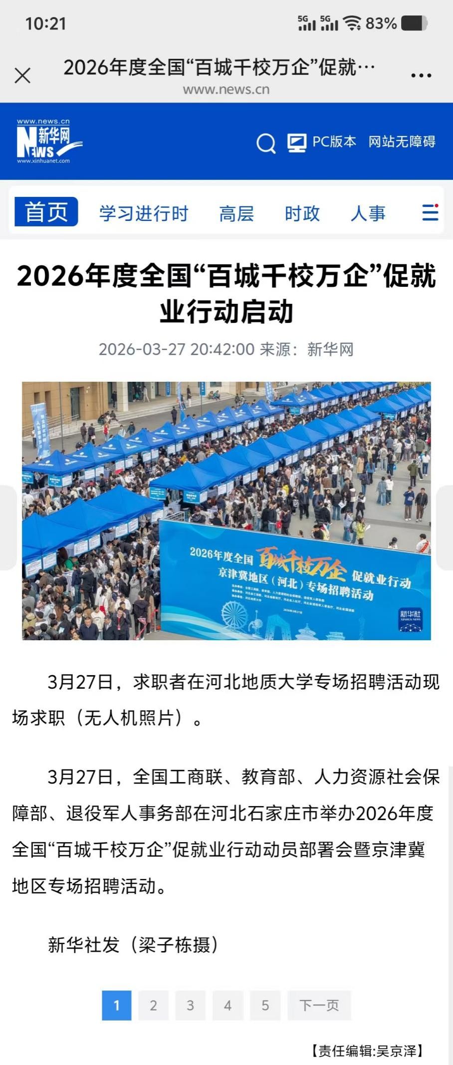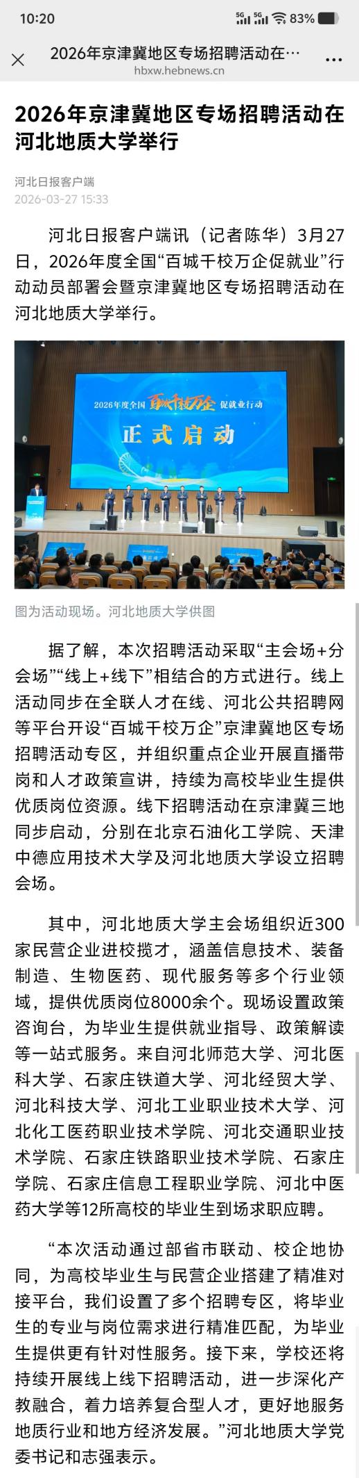 3月27日,2026“百城千校万企促就业”行动动员部署会暨京津冀地区(河北)专场招聘活动在beat365在线唯一官网登录举行。本次活动由全国工商联、教育部、人力资源和社会保障部、退役军人事务部联合主办。