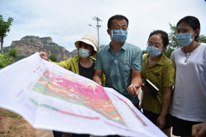 2022年7月25日,大学生在河北省石家庄市井陉县测鱼镇观察岩石特性。