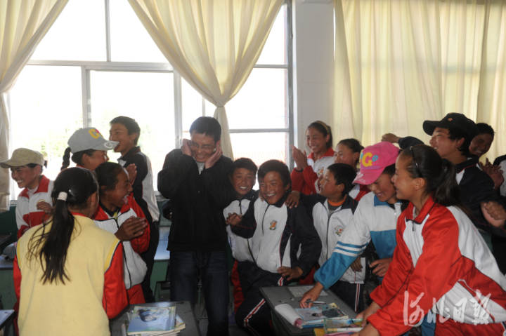 ↑岳刚和学生们在一起。河北日报资料片