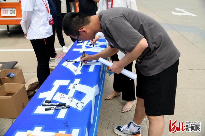 图为活动现场学生在宣传横幅上签名。 张超摄