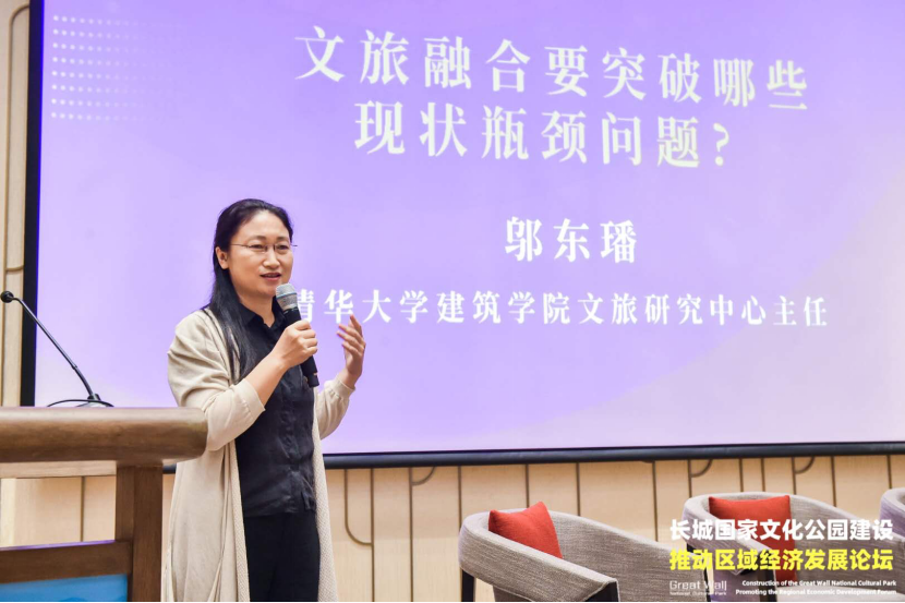论坛的第二个交流主题是长城的文旅融合。清华大学建筑学院文旅研究中心邬东璠主任在主旨发言中,提出长城文旅融合的核心问题,是要清楚融合的是什么样的文化和什么样的旅游。首先,长城文旅融合,要融合长城遗产本身的文化,也要融合长城沿线区域的地方文化;要融合历史文化也同时要融合当代文化;要融合物质文化也要融入非物质文化;长城的文化事业与长城文旅产业也要融合起来。长城文旅融合,要融合各种文化的旅游载体,包括对外开放的文保单位、历史文化名城名镇名村、开展旅游的乡村和传统村落、各级非物质文化遗产、博物馆和文化馆;还有很多自然类的景区,风景名胜区、被归类到自然公园的森林公园、地质公园,以及被归类到国家公园的自然保护区,还有作为地方发展旅游抓手的A级景区、旅游度假区品牌、全国红色旅游经典景区,这些都可能成为长城文旅融合的空间载体。其次,哪些文化和哪些旅游应该融合,怎样融合,是长城国家文化公园建设在文旅融合层面值得深入探索和解决的问题。在共享、共建、共融的新时代背景下,长城文化与旅游的融合可能涉及事业与产业的融合、文化人与旅游人的融合、文化政策与旅游政策的融合、历史文化与旅游产品的融合、文化系统与分散的旅游空间的融合,旅游空间与文化传播空间的融合。