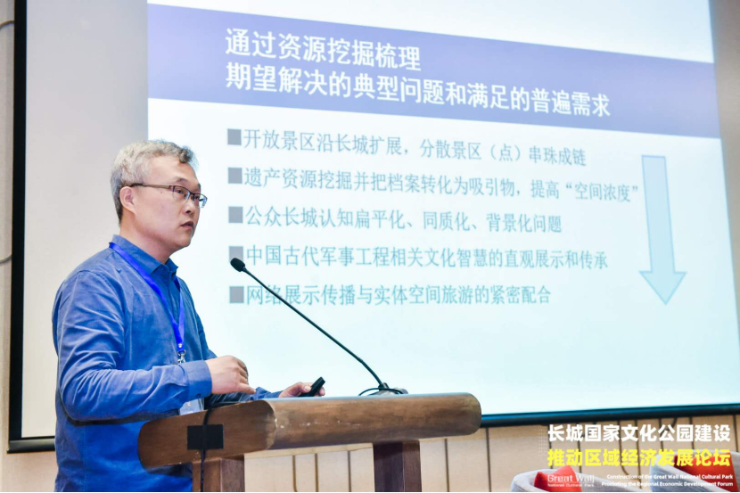 论坛的第三个交流主题是长城的数字化保护传承。天津大学建筑学院李哲副教授,带来题为《长城国家文化公园遗产资源挖掘、梳理和运用方法》的主旨发言,针对长城国家文化公园建设提出四个方面的解决策略。一、在全线宏观和细节微观双向深入发掘,是今后长城保护、研究、展示各方面工作的必然趋势;二、突破现有景点之间的“藩篱”,实现“信息共举”与“交通联结”两方面的联合是多赢路径;三、物质遗产(包括可移动/不可移动文物),非物质遗产的融通合璧,是展示升级的阶段要求;四、对于游客应该有覆盖全县的遗产资源人工智能推介,游步道路线引导等线上线下的互动。