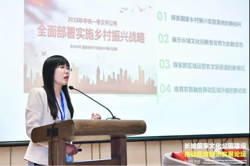 论坛的第五个交流主题是农业发展与乡村振兴。中国农业大学规划设计研究院乡村振兴战略规划所刘晴所长,从战略策划和运营创新的角度,针对长城国家文化公园建设中的农旅融合主题进行了主旨发言。刘所长提到,长城国家文化公园建设要与乡村振兴和脱贫攻坚有机衔接,要在长城国家文化公园建设文化高地的背景之下,将长城沿线区域经济发展与国家乡村振兴战略相结合,探索出长城国家文化公园建设下的国家乡村振兴战略新标杆,沿长城分布省市县树立跨区域农文旅融合的新模式,培育农旅带动长城区域经济发展的新动能。