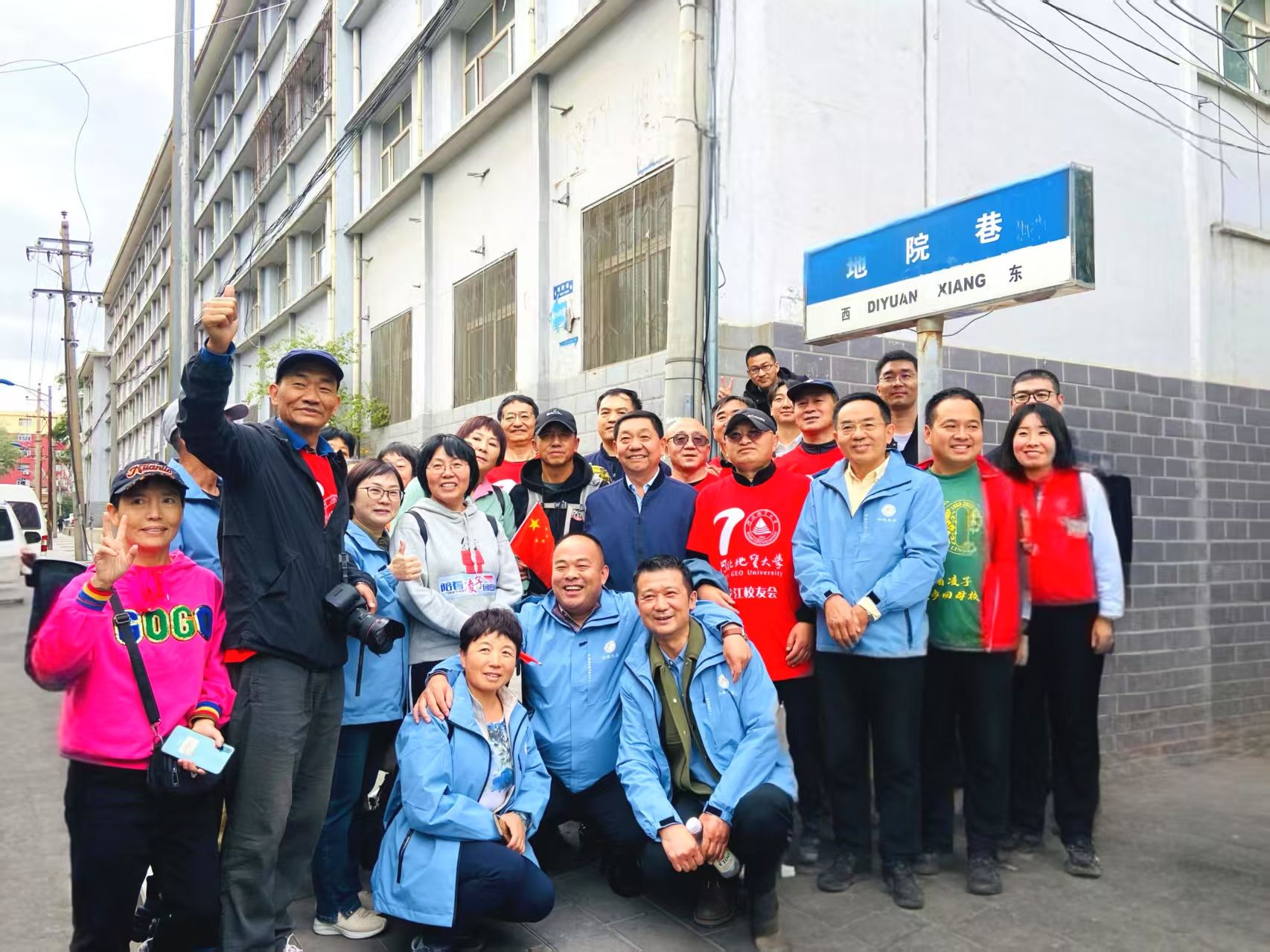凌子(王桂林)徒步抵达母校旧址与校友在地院巷前留影