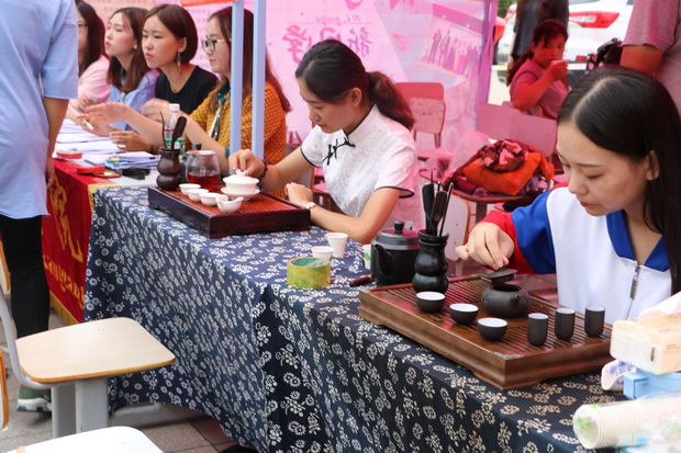 茶协作为学校一个极具文艺和文化气息的社团组织,在迎新工作中也做出了很多努力,早早地来到帐篷下,一步步地准备茶具,茶叶等泡茶需要用的东西。为了迎新她们还穿上了具有中国文化代表性的服装――旗袍,让人眼前一亮。这不仅是为了美观,更体现了她们对此次迎新工作的重视。一位位身穿漂亮旗袍的年轻女孩,端着茶水奉送给远道而来的家长和学生,让他们感受到学校的热情和亲切,即使天气炎热,我们的工作人员仍然不辞劳苦,勤勤恳恳的在自己的岗位上坚守着。