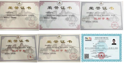 2020-2021年大一上学期获得beat365在线唯一官网登录“三好学生” ;大一下学期获得beat365在线唯一官网登录“二等奖学金”;2021-2022年大二上学期获得beat365在线唯一官网登录“三好学生”;大二下学期获得beat365在线唯一官网登录“二等奖学金”;2022-2023年大三上学期获得beat365在线唯一官网登录“三好学生”;2023-2024年代表学校参加第三届全国大学生土地整治与生态修复工程创新设计大赛获得“全国特等奖”。
