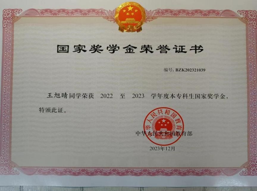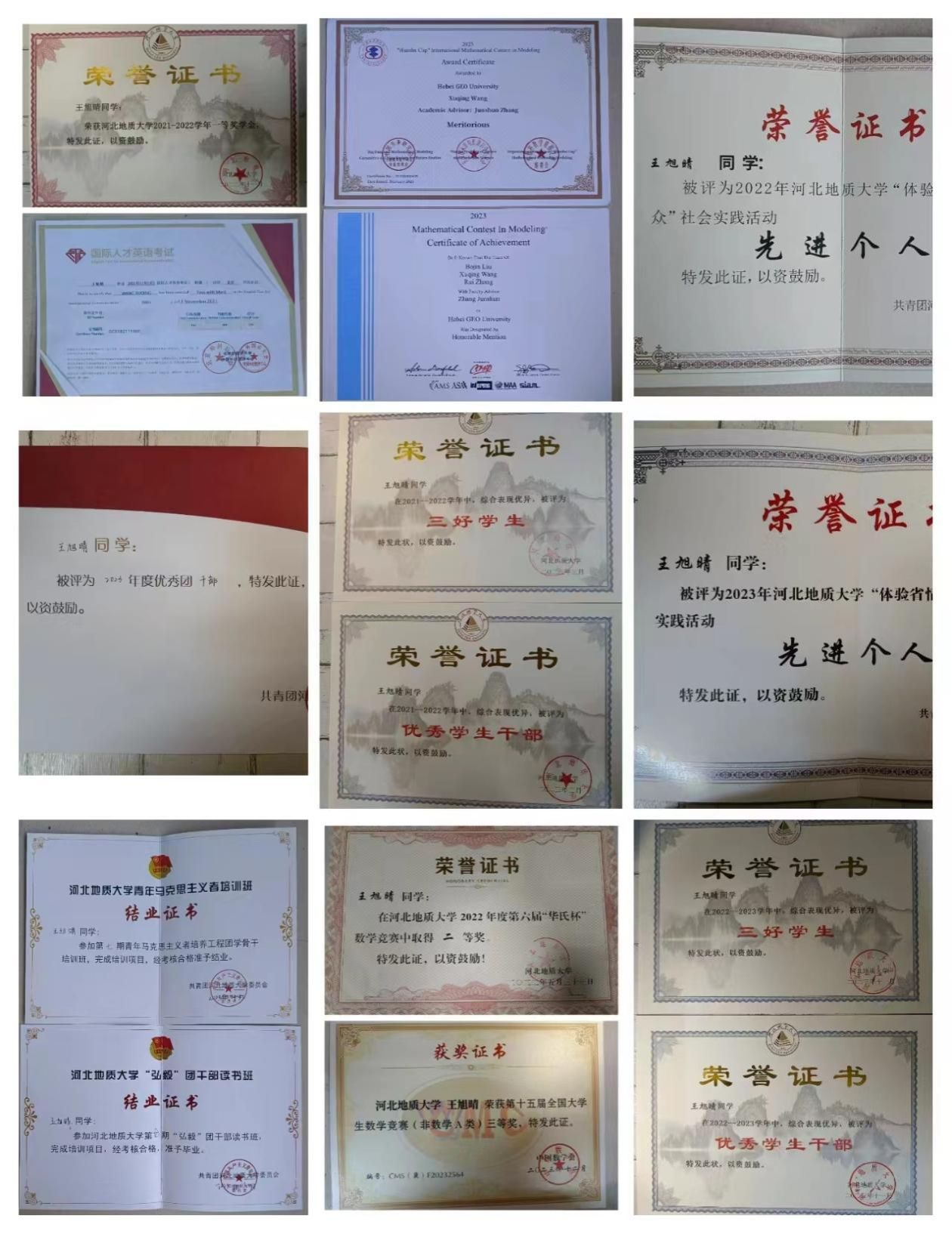 2022-2023年度国家奖学金,2023-2024学年河北省省级三好学生,2023年度优秀团干部,2023年“华数杯”国际大学生数学建模竞赛一等奖,2023年美国大学生数学建模竞赛H奖,第十五届全国大学生数学竞赛河北赛区三等奖,第八届中国“互联网+”大学生创新创业大赛校级二等奖,2021-2022学年及2022-2023学年校级一等奖学金、校级三好学生、优秀学生干部,2022年及2023年beat365在线唯一官网登录“体验省情、服务群众社会实践先进个人。