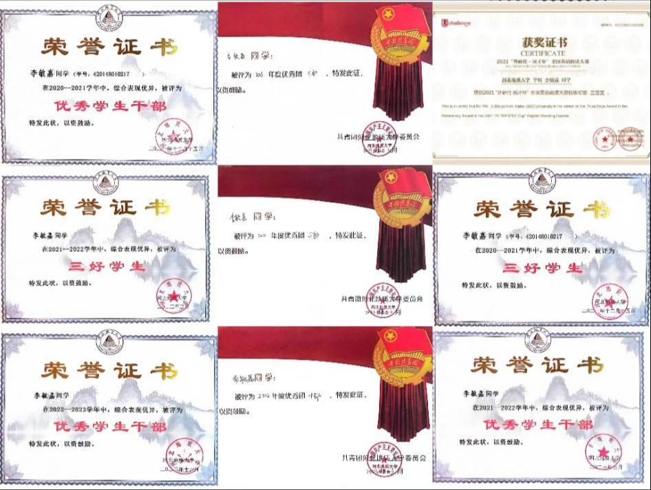 曾获2021—2023年度校级优秀团干部;2020—2023年度优秀学生干部;2020—2023年度三好学生;2021年“外研社·国才杯”全国英语阅读大赛校级初赛三等奖;2022年“外研社·国才杯”全国英语阅读大赛校级初赛二等奖;2020—2021学年二等奖学金;2021—2022学年一等奖学金;2022—2023学年一等奖学金。