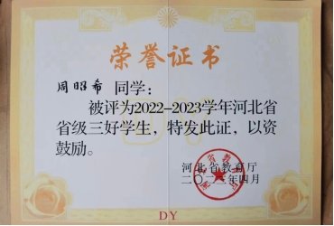 2021-2022学年度国家奖学金;2022-2023学年河北省省级三好学生;2022年全国大学生数学建模竞赛河北省二等奖。