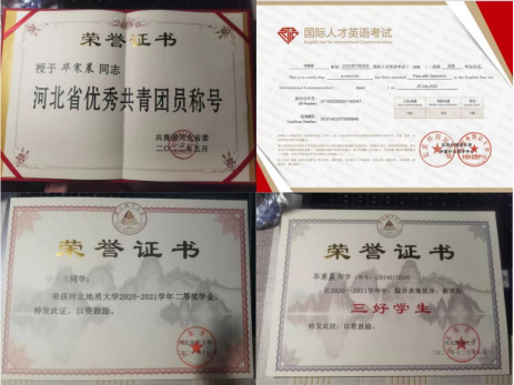 2021—2022年度成绩全系排名第一,2021年,2022年,2023年连续三年荣获校级奖学金,2022年荣获河北省“优秀共青团员”荣誉称号,在国才考试中取得了“优秀”等级,2022年参加北京冬季奥运会志愿服务活动,2023年荣获“挑战杯”大赛省级三等奖。