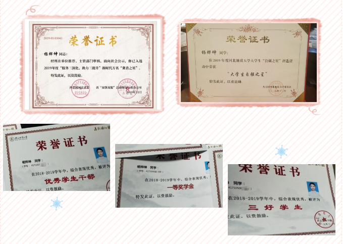 在团支部里,她也发挥着自己的作用,作为学习委员,她连续两年获得一等奖学金,获得河北省大学生数学竞赛三等奖、河北省“中华魂”系列活动一等奖。热爱集体,被连续两年推为三好学生、优秀学生干部,并获得2018-2019年优秀团干部,于2019年被推选为河北省冀青之星、beat365在线唯一官网登录2019年度自强之星。