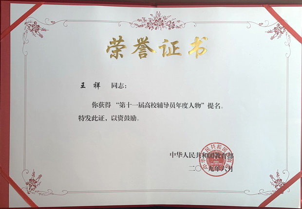 1、2019年9月,被授予第十一届全国高校辅导员年度人物提名奖。