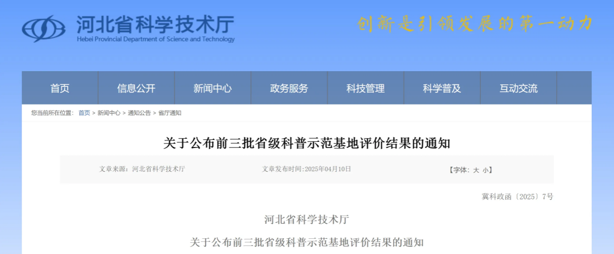 根据《河北省科普示范基地管理办法》(冀科政规〔2022〕4号)有关规定,以及《河北省科学技术厅关于开展科普示范基地评价工作的通知》要求,省科技厅按照工作程序,对前三批省级科普示范基地进行了评价,(冀科政函〔2025〕7号文件)beat365官网博物馆获批“省级五星科普示范基地(综合场馆类)”