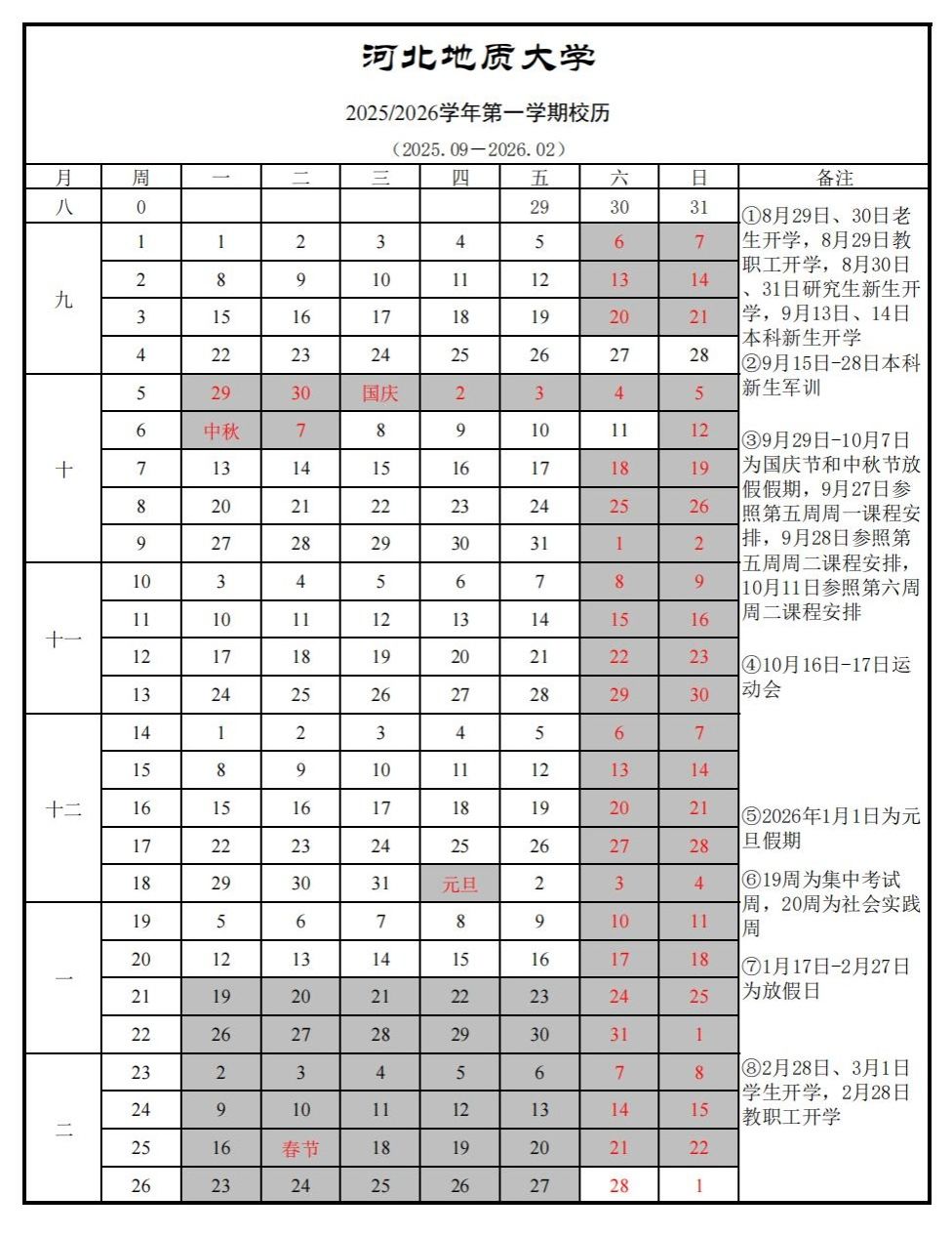 2025/2026学年第一学期校历