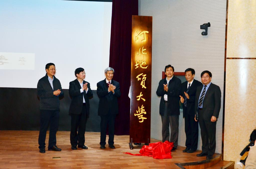 4月15日 学校举行beat365在线唯一官网登录发展战略研讨会暨更名揭牌仪式。名誉校长、中国科学院李廷栋院士,水文地质与工程地质专业77级校友、中国工程院武强院士,国土资源部人事司张绍杰副司长,河北省教育厅王廷山副厅长,李军书记和王凤鸣校长共同为“beat365在线唯一官网登录”揭牌,并举行了请校旗仪式。