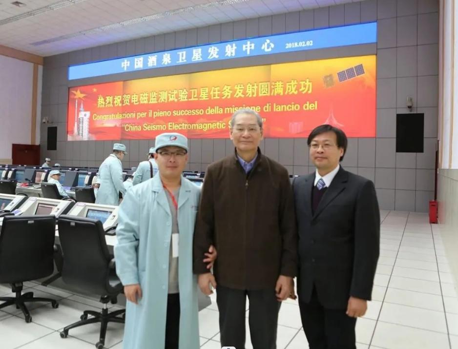 ▲“张衡一号”卫星发射成功后,申旭辉(右一)与陈运泰院士(中)合影留念