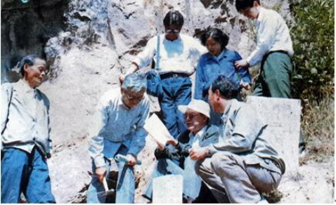 杜汝霖教授(左二)陪同原国务委员、国家科委主任宋健(右二)考察蓟县地质剖面
