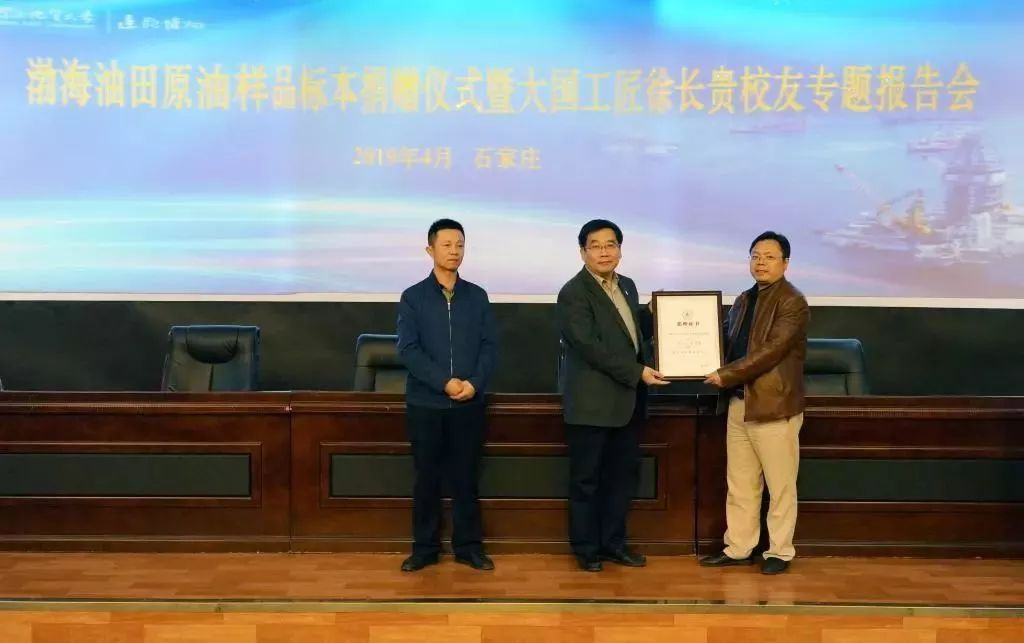 当天下午,在春秋讲堂,徐长贵校友以“渤海复杂断裂带油气富集机理与大中型油气田勘探实践”为题作了专题学术报告,并向母校捐赠亲手采集并制作的渤海油田珍贵原油样品标本一套,王凤鸣代表学校为徐长贵颁发了捐赠证书。