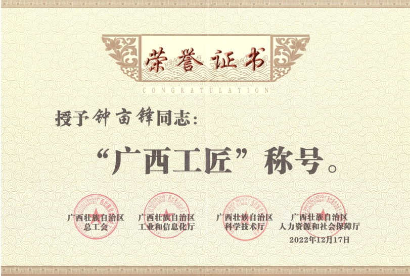 劳动创造幸福,匠心成就梦想。2月28日广西壮族自治区总工会、工业和信息化厅、科学技术厅、人力资源和社会保障厅等四部门联合发出通知,决定命名40位技能高手为2022年“广西工匠”。其中beat365官网95级校友钟亩锋榜上有名。